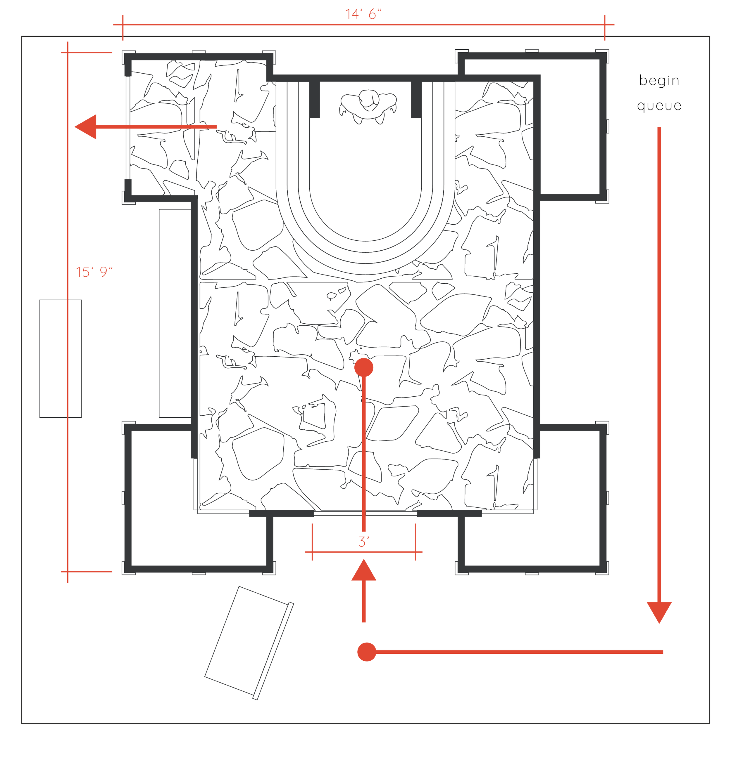 [ Visitors queue along the side of the booth and traffic is directed to ensure only small groups are in the space. ]