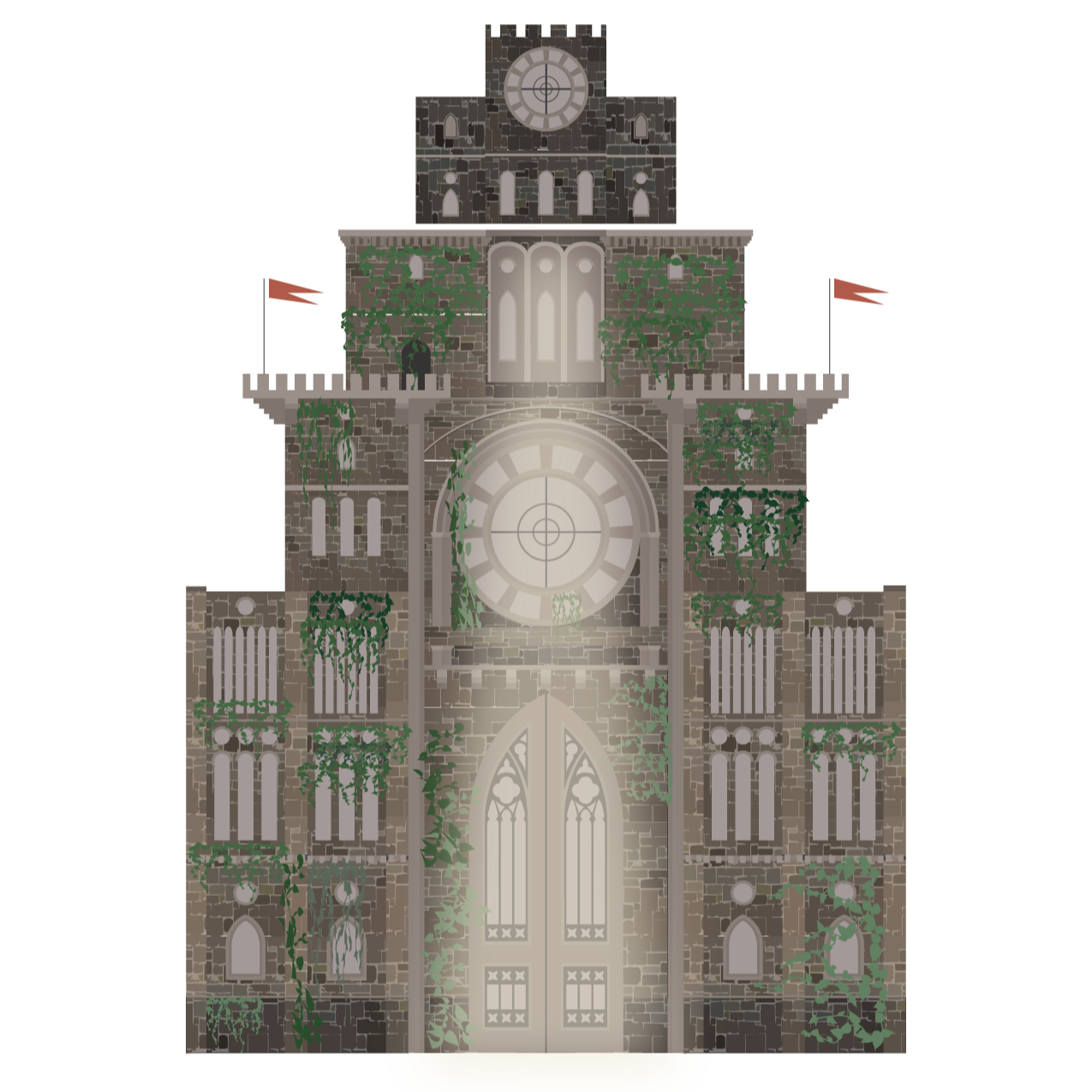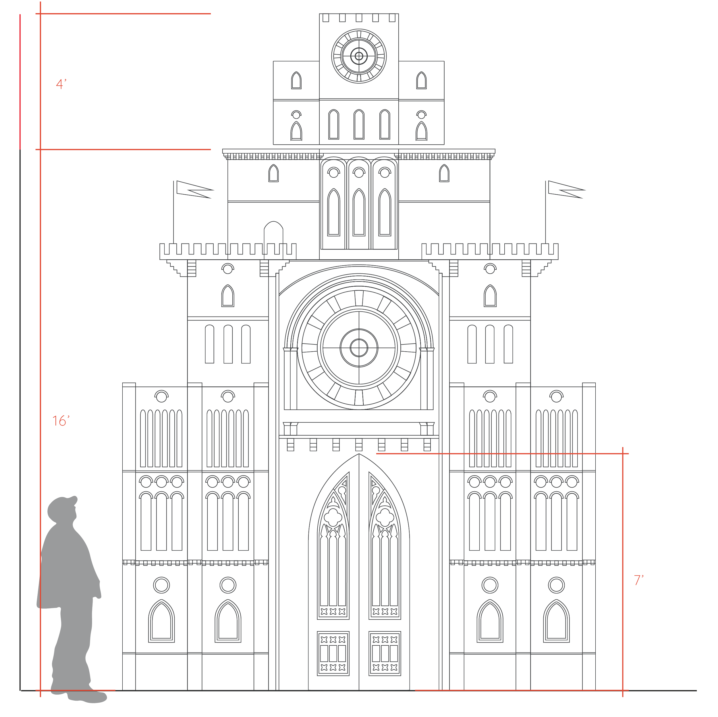[ The exterior of the booth is designed to look like the castle in the film. Using forced perspective, giving the illusion of a taller structure, the top section is a hanging printed sign to extend the overall height of the booth. ]